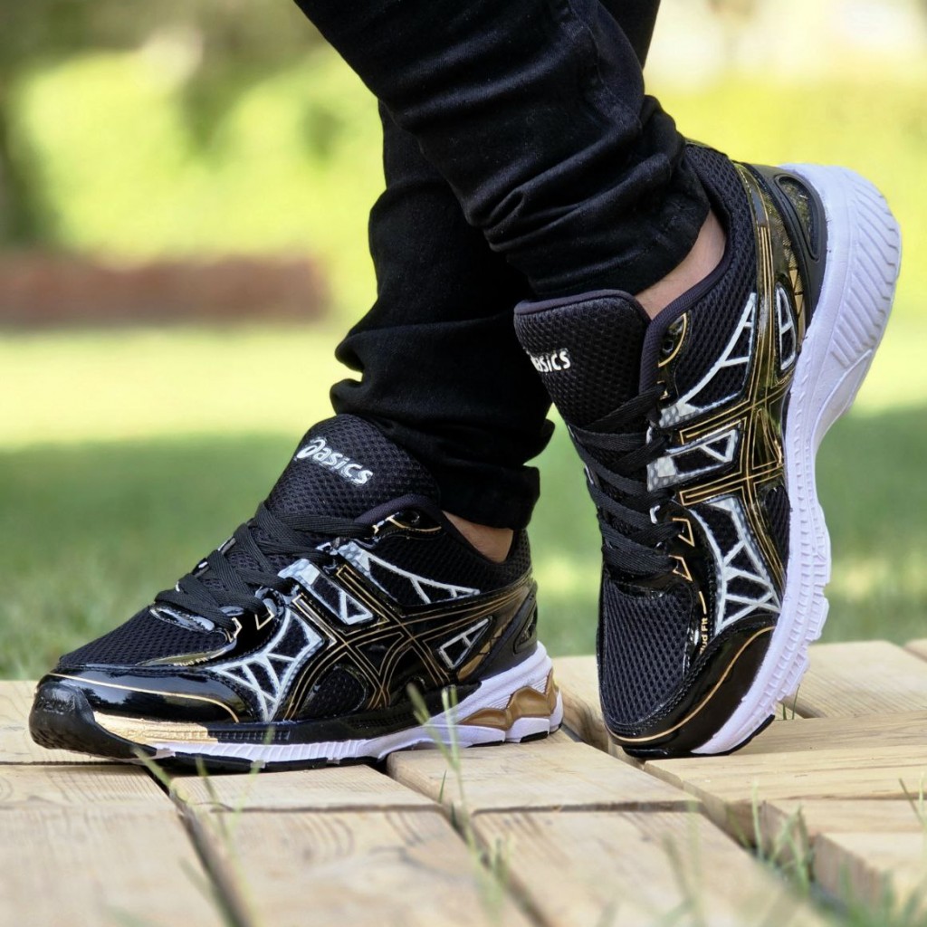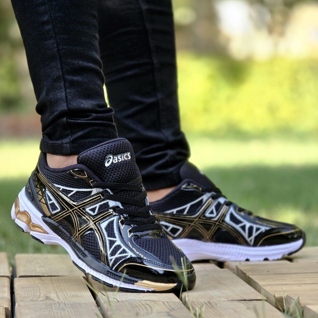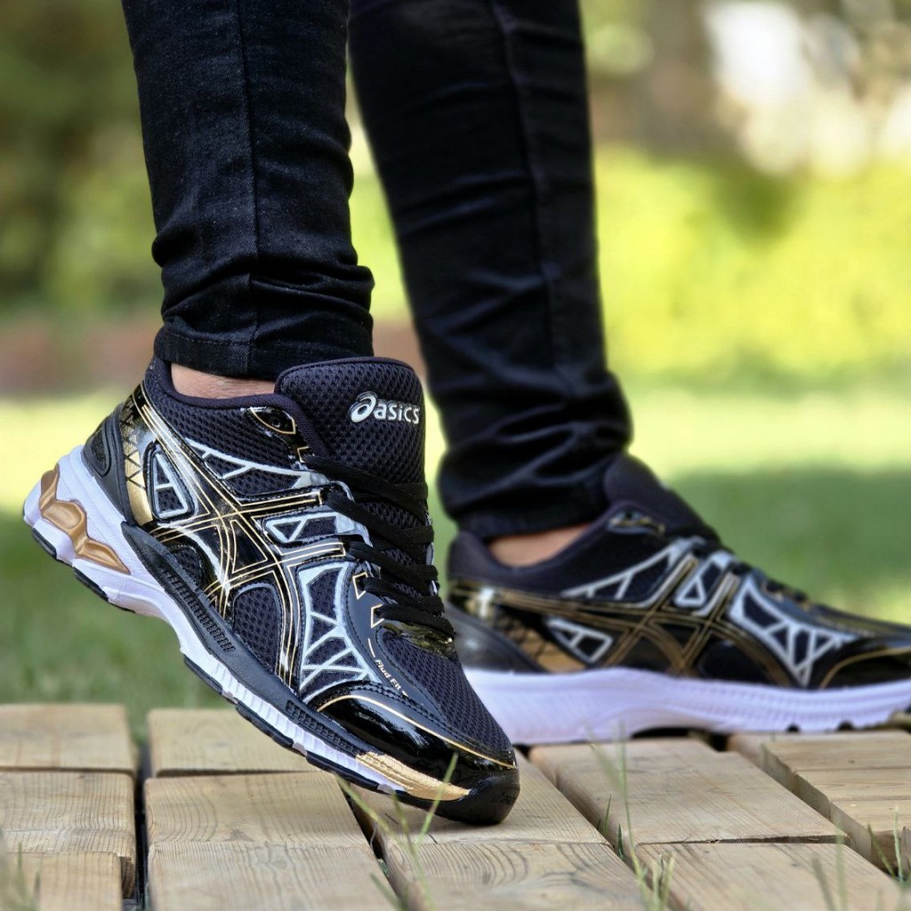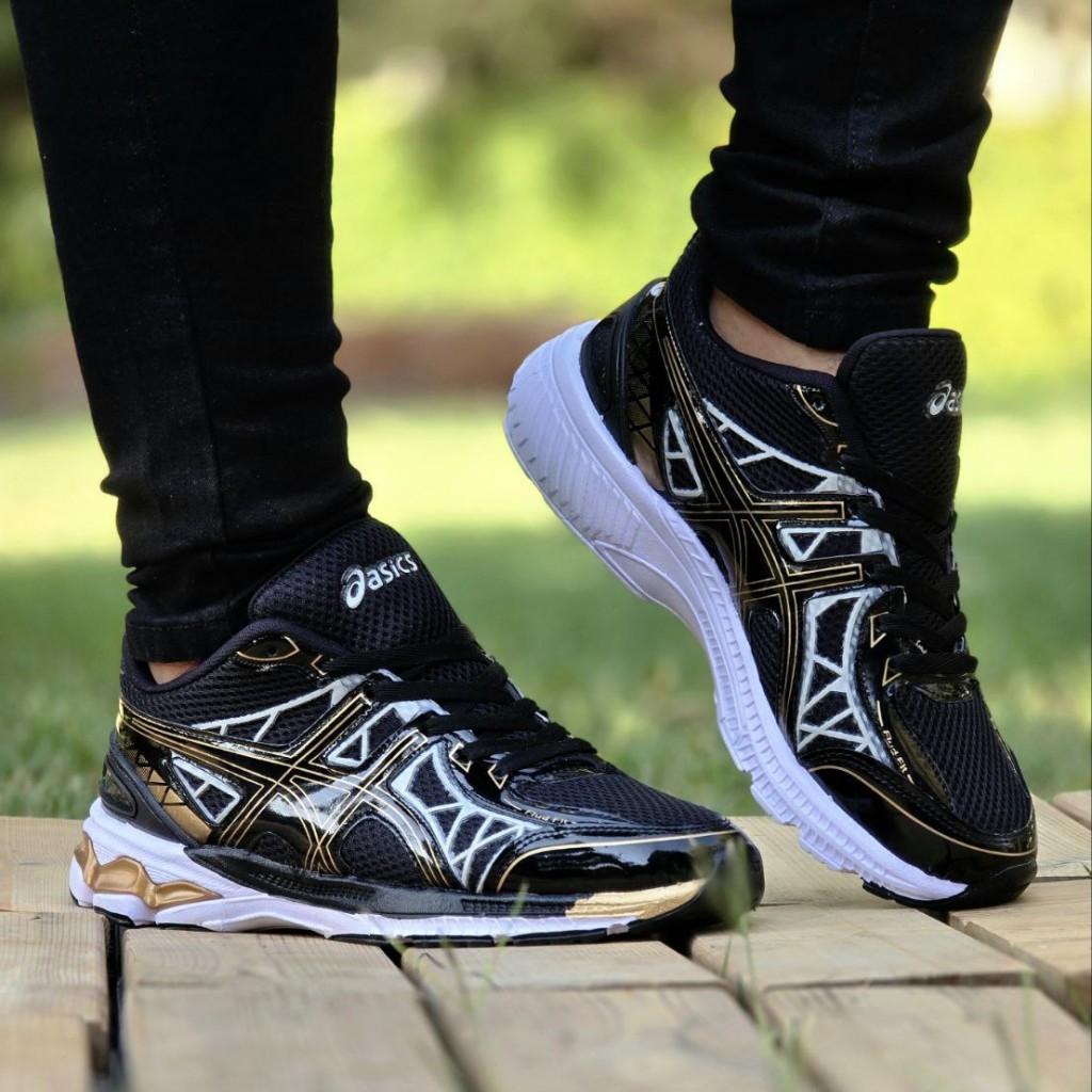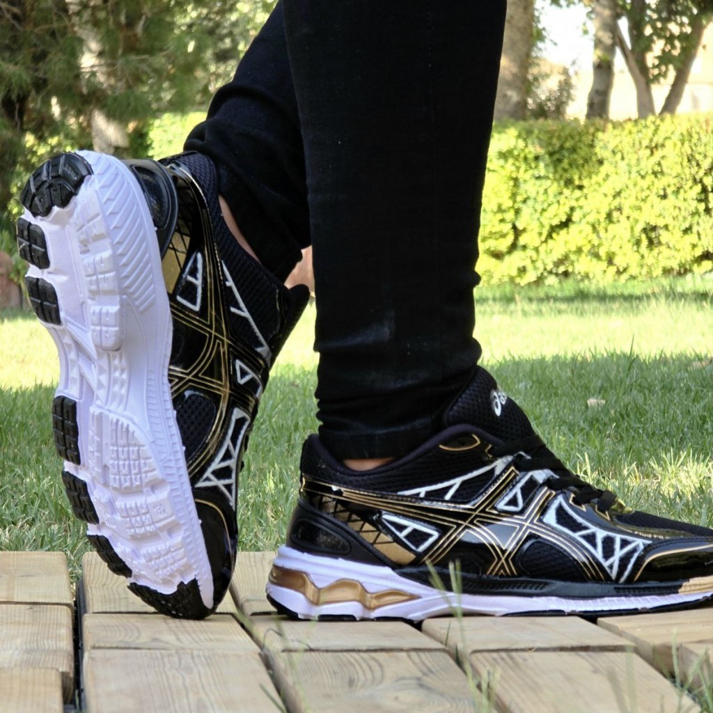 فروش ارزان کفش کتونی اسپرت مردانه مدل اسیکس راحت و زیبا رنگ مشکی طلایی با ارسال رایگان